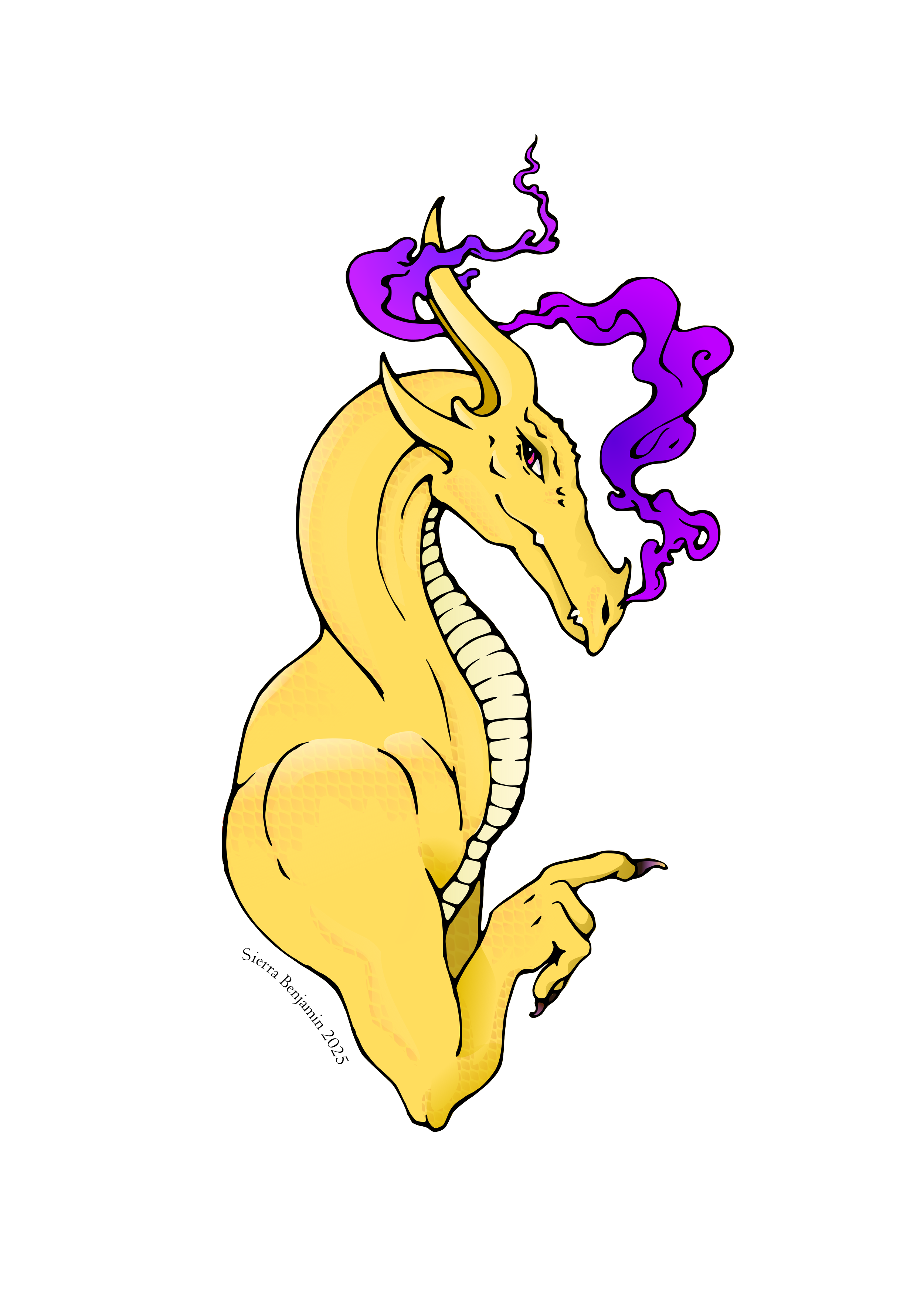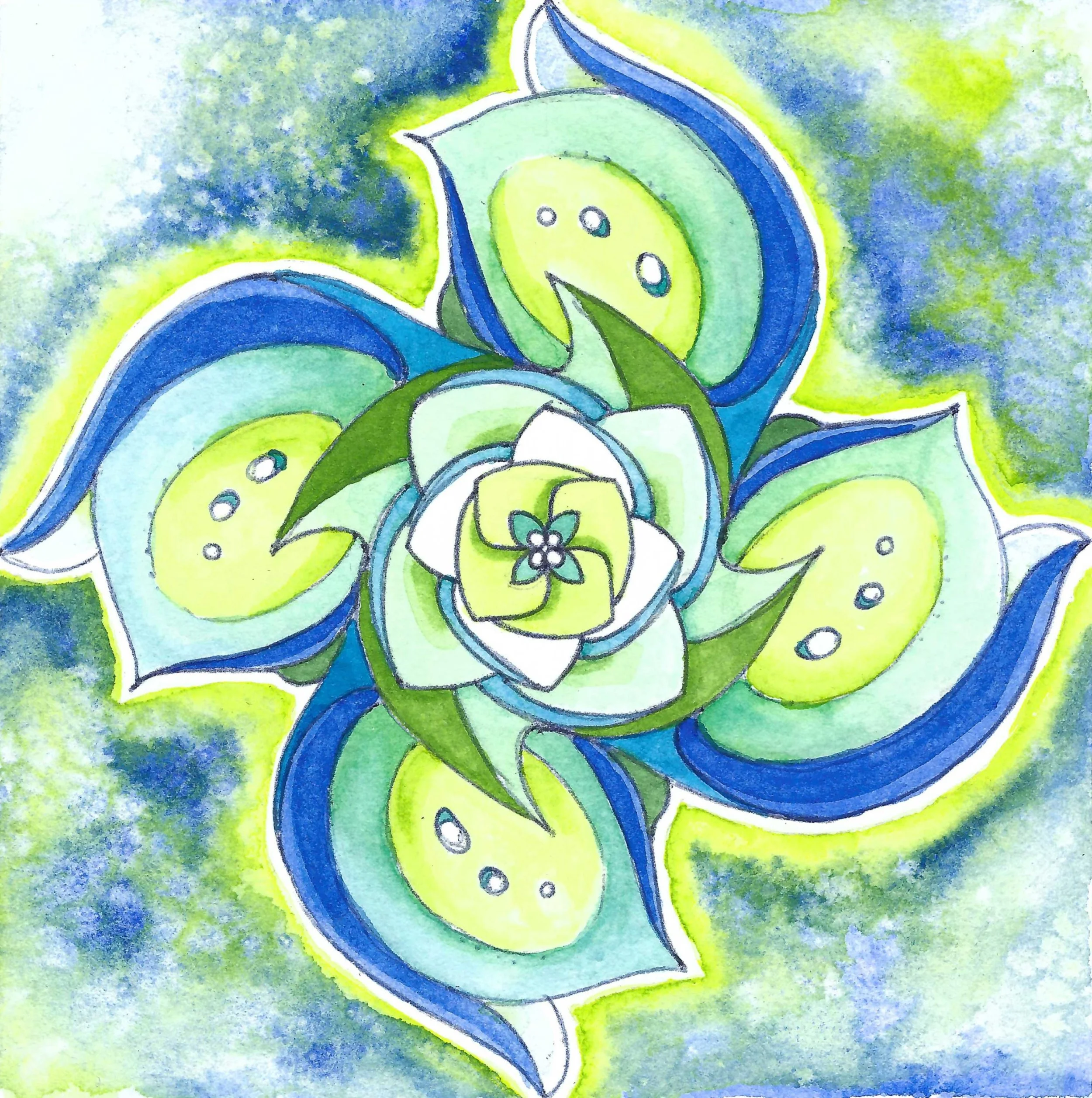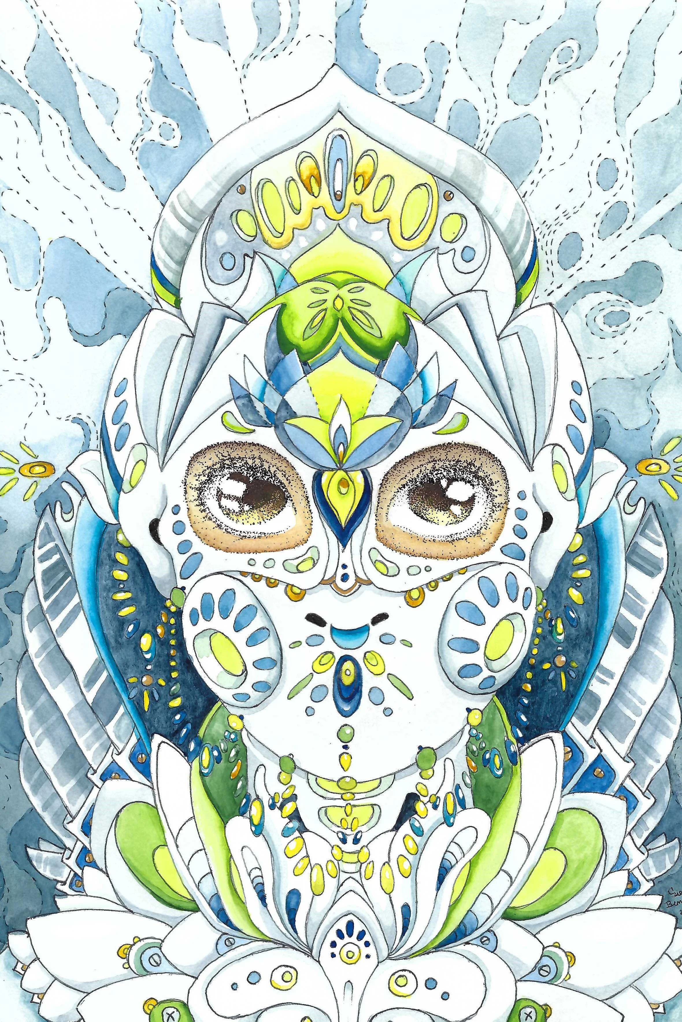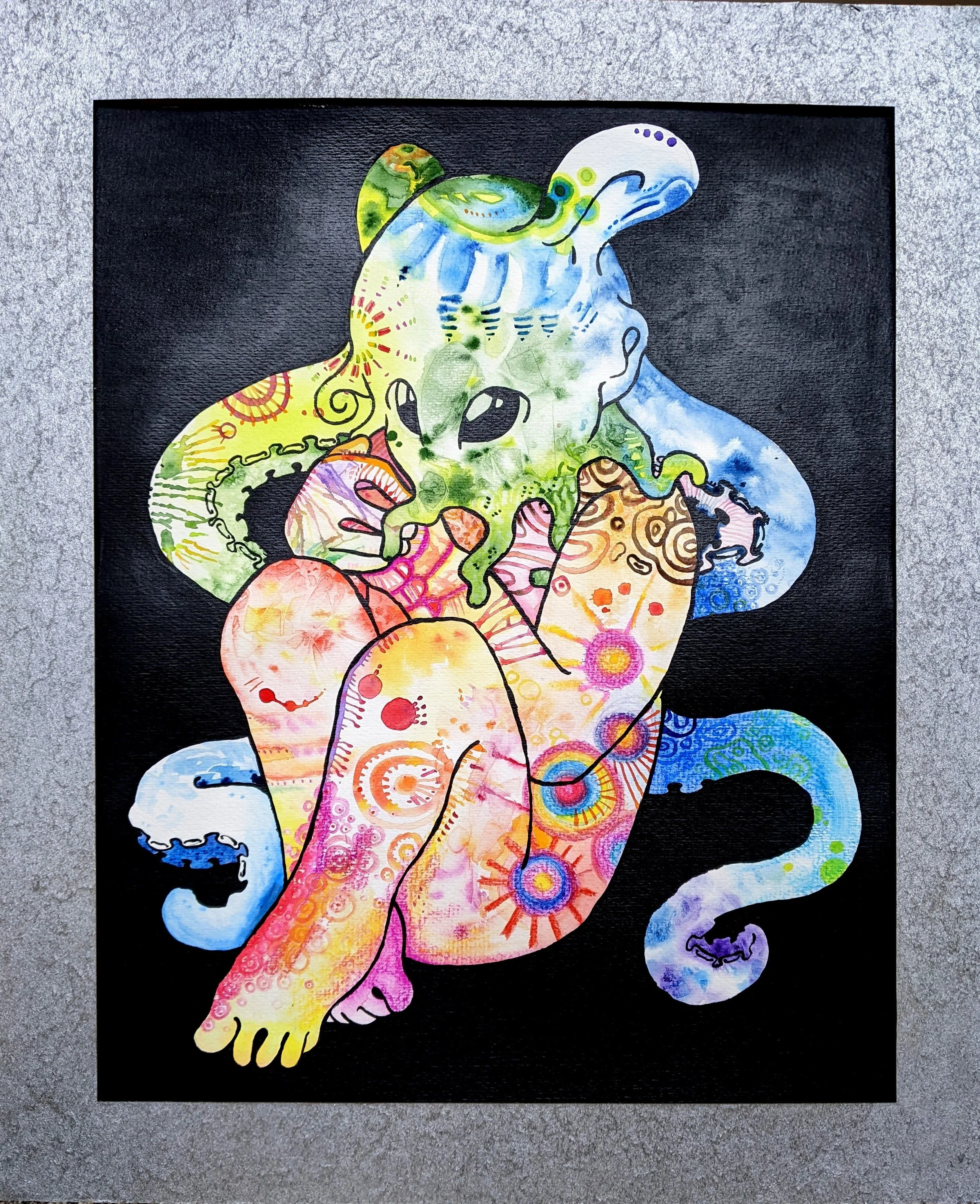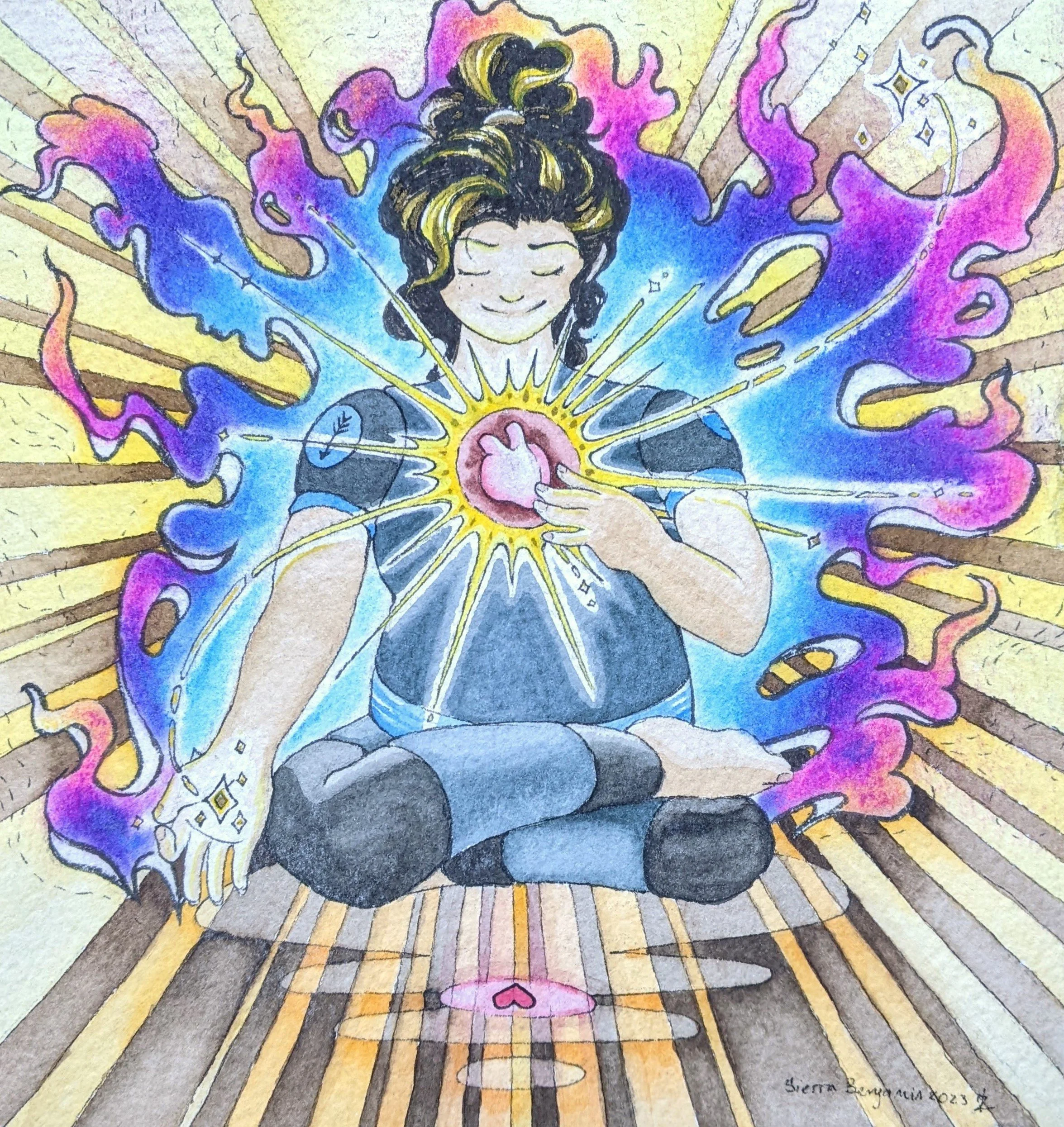 Painting of woman in yoga pose with rainbow smoke holding shining heart
