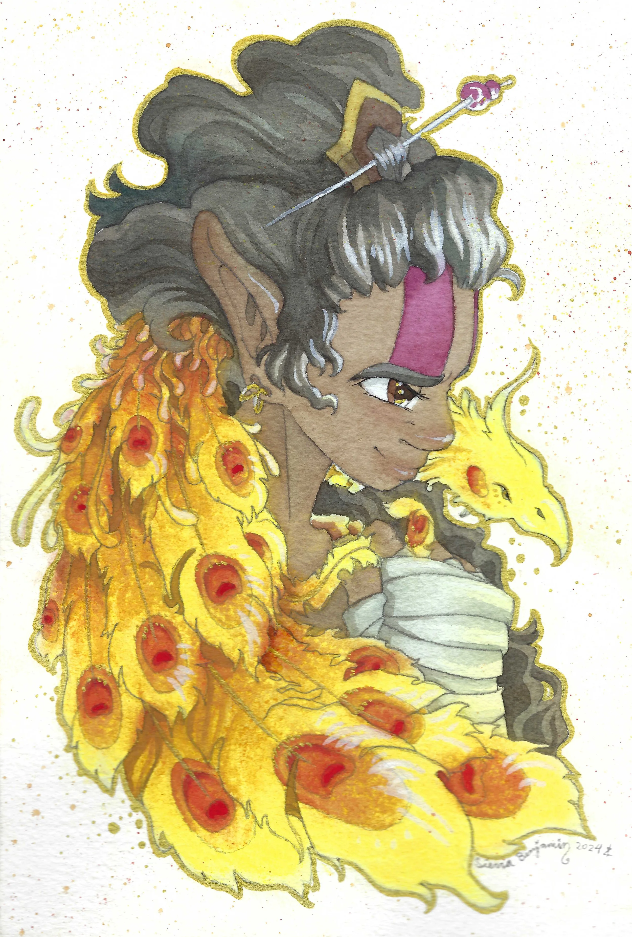 Female elven boxer with handwrap and phoenix perched on shoulder